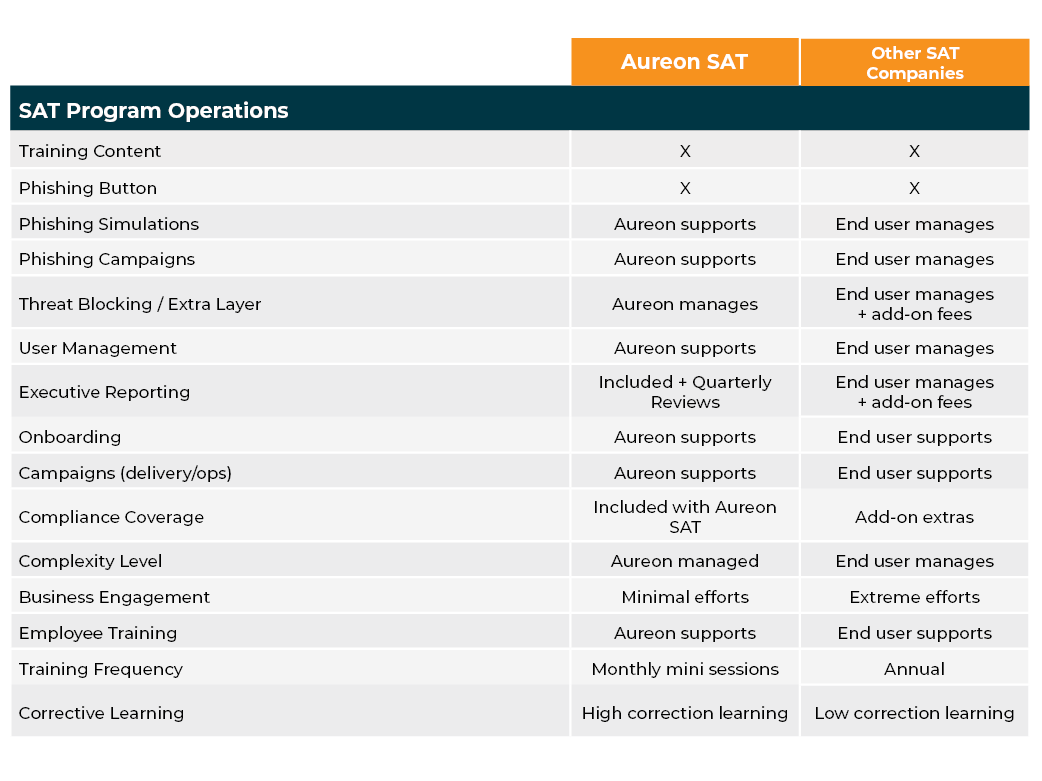 Security Awareness Training (SAT) teaches employees how to recognize, avoid, and report cyber threats, especially phishing, through short, relevant training and real-world simulations. Aureon offers scalable solutions tailored to your business. We help reduce costs, simplify IT management, and improve the experience for both employees and customers.
